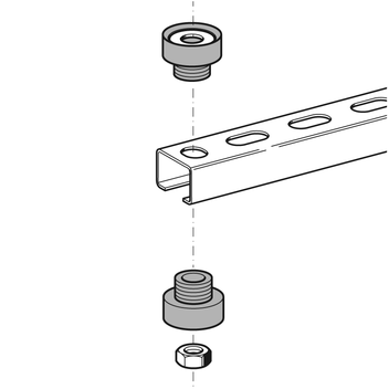 Insertar la arandela de insonorización SDE en el taladro circular de la parte posterior del carril y dentro de la abertura del carril. Se introduce la varilla roscada y posteriormente se asegura con una tuerca.